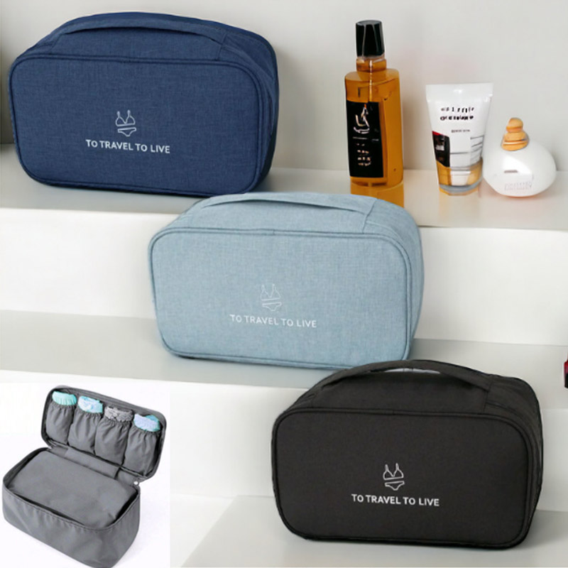 Bolso organizador femenino para viajes, ideal para organizar la ropa interior. Posee un cierre principal y un neceser pequeño con velcro. Cuenta con cuatro bolsillos interiores. Incluye 1 logo impreso con serigrafía 1/0 color.