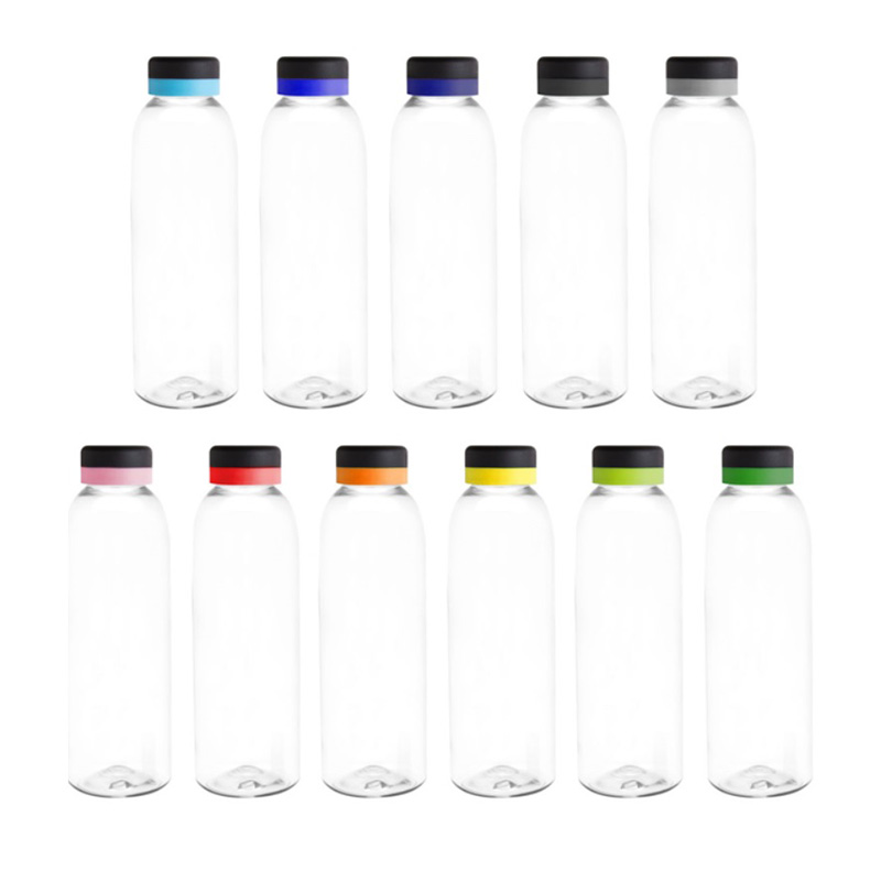 Botella de plástico transparente. Tapa a rosca (blanca o negra) con anillo de silicona de diferentes colores. Disponible en plástico transparente o plástico translúcido negro. Tapas disponibles con anillo de silicona en diferentes colores. Incluye 1 logo impreso full color (impresión digital).