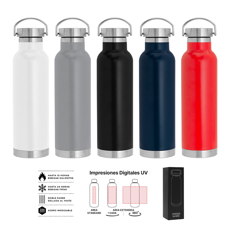 Botella térmica doble pared, sellada al vacío. Interior en acero 304 y exterior en acero 201. Tapa de acero a rosca con manija rebatible metálica. Incluye 1 logo grabado láser.