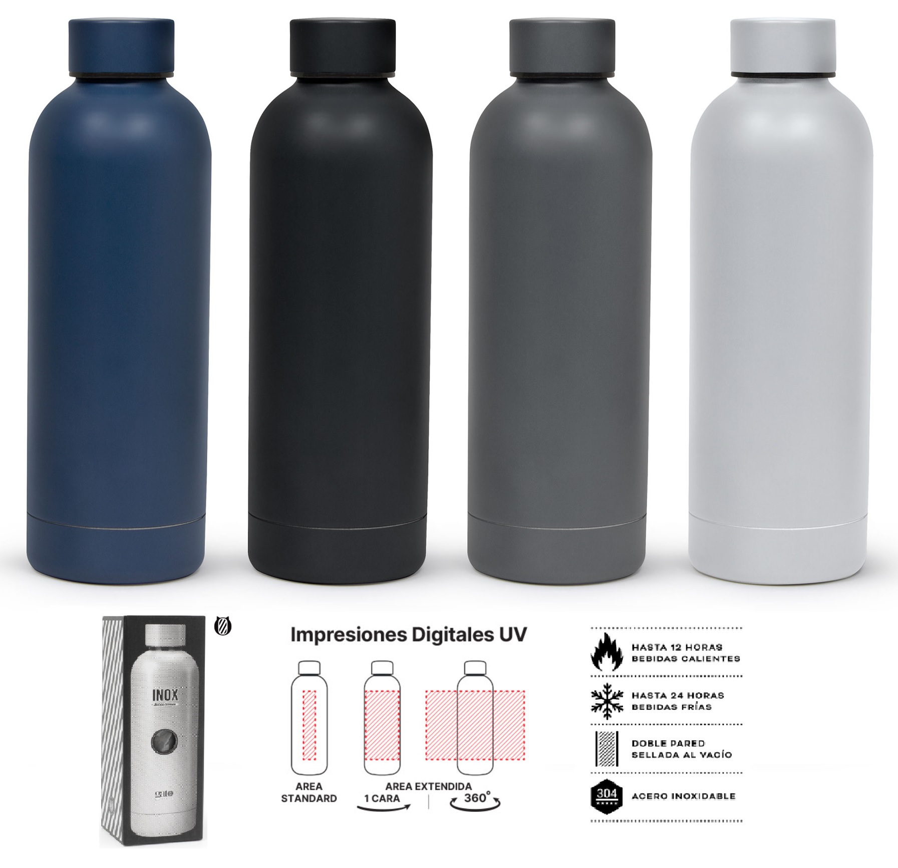 Botella térmica doble pared, sellada al vacío. Interior en acero 304 y exterior en acero 201. Incluye 1 logo grabado láser.