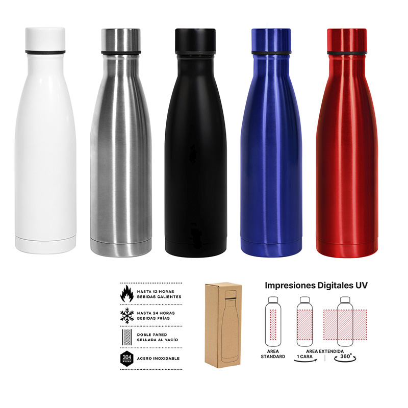 Botella térmica doble pared, sellada al vacío. Interior de acero 304 y exterior de acero 201. Cuerpo y tapa a rosca del mismo color. Incluye 1 logo grabado (láser).