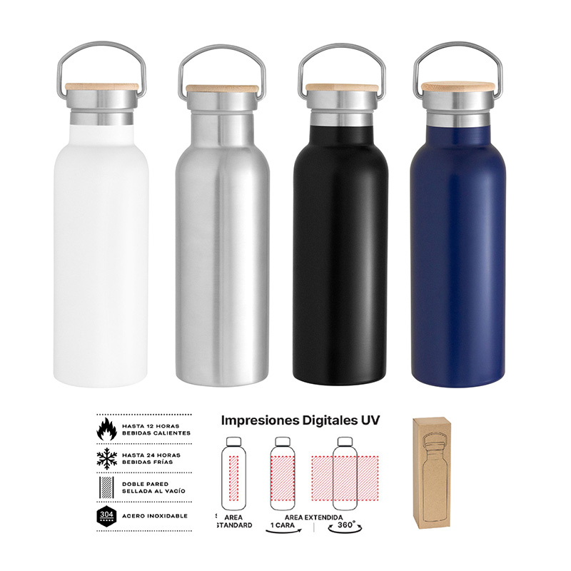 Botella térmica doble pared, sellada al vacío. Interior en acero 304 y exterior en acero 201. Tapa de acero inoxidable con manija metálica rebatible y detalles en bambú. Anillo de silicona antiderrame. Incluye 1 logo grabado láser.