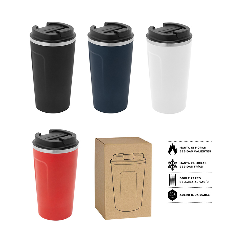 Mug térmico doble pared, sellado al vacío. Interior y exterior de acero. Tapa plástica rosca con seguro hermético anti derrame. Incluye 1 logo grabado (láser).