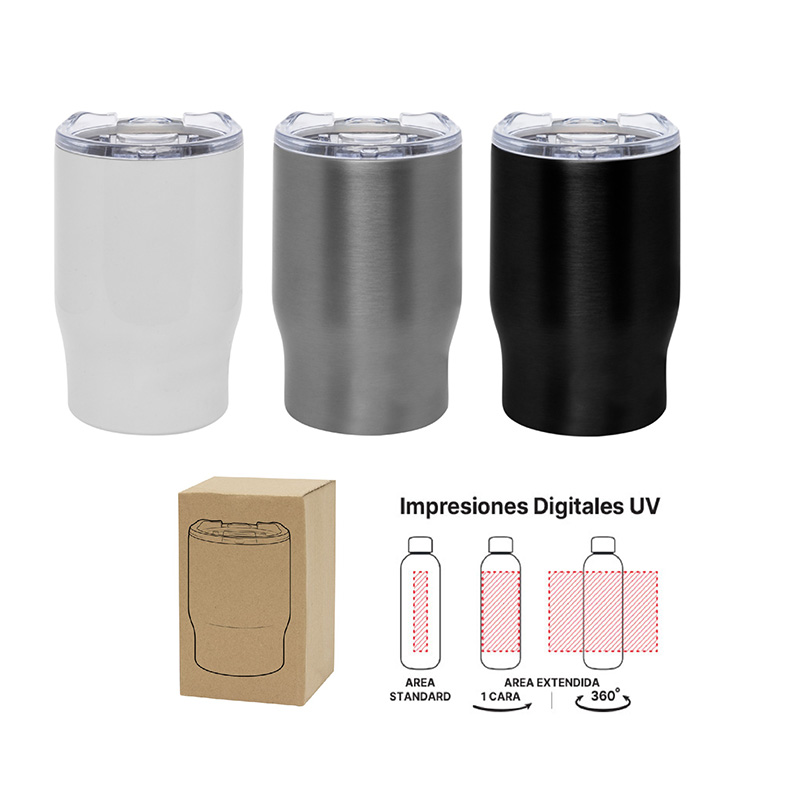 Mug térmico doble pared. Interior y exterior de acero. Tapa plástica transparente rosca con cierre anti derrame. No utilizar con bebidas gaseosas. Incluye 1 logo grabado láser.