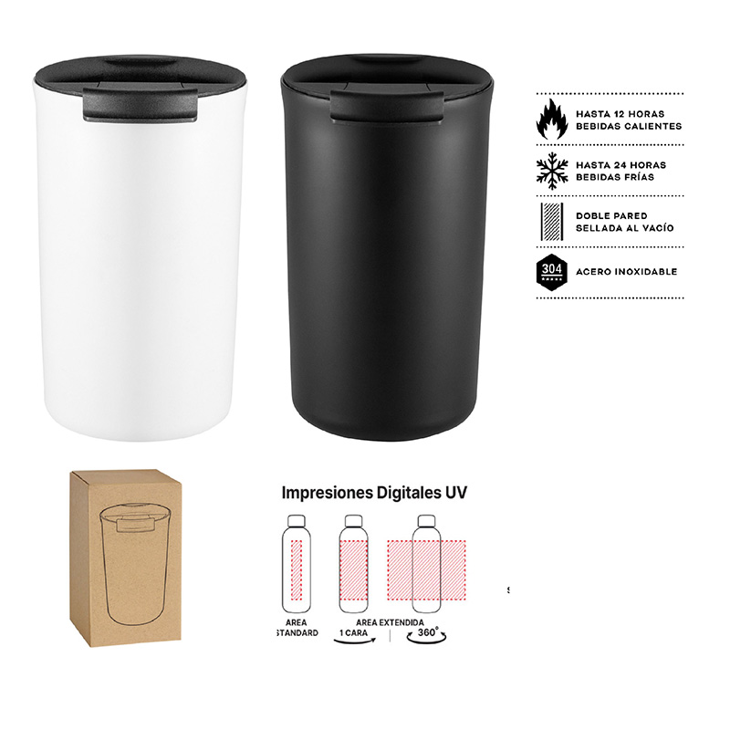 Mug térmico doble pared, sellado al vacio. Interior en acero 304 y exterior en acero 201, con acabado mate. Tapa de polipropileno y anillo de silicona antivuelco. Incluye 1 logo grabado láser.