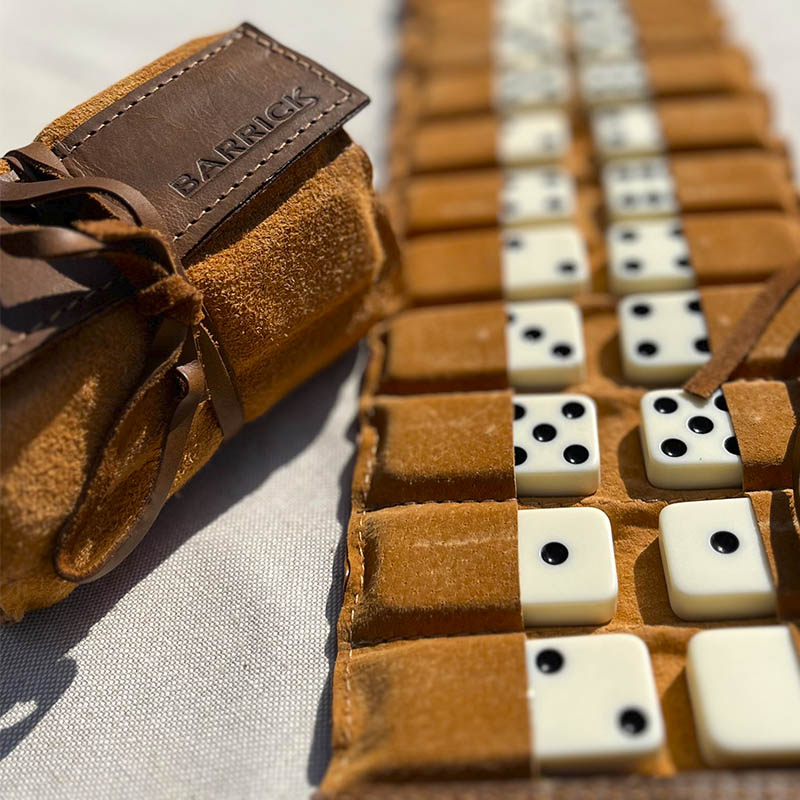 Clásico juego de dominó en estuche de cuero de carpincho, con plaqueta de cuero liso. Incluye un logo grabado en cuño en la cara frontal. Producto artesanal y hecho en Chile.