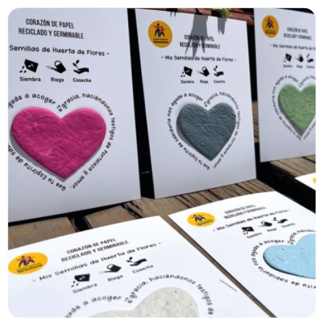 Para regalos masivos o merchandising sustentable destacamos los productos hechos a partir de papel sembrable. Aquí uno de los más populares es la “Tarjeta Sembrable” que es un tarjetón personalizado como quieras y lleva un corazón troquelado de papel sembrable que contiene semillas de hortalizas y flores. También hay figuras de maceta y circulo disponibles. Este regalo nos lo piden mucho para regalos masivos o como recuerdo verde de algún gran evento.